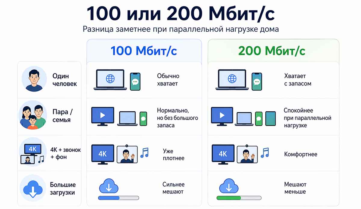 На практике переход со 100 на 200 Мбит/с чаще ощущается так: крупные загрузки меньше мешают остальным устройствам, несколько параллельных задач реже начинают конкурировать за канал, а вечерняя бытовая нагрузка переносится спокойнее. Если нужно глубже понять, где для квартиры проходит нижняя комфортная граница, полезно отдельно разобрать, много ли 100 Мбит/с для дома в 2026 году.
